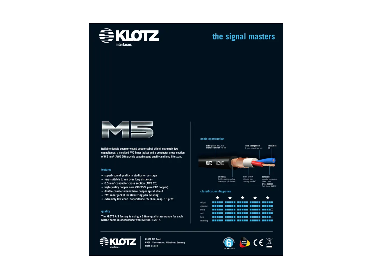 Микрофонный кабель верхнего уровня M5 KLOTZ AIS GmbH гарантирует передачу сигнала практически без потерь на большие расстояния и создает непревзойденную защиту от помех за счет сложной структуры экрана. Двойной спиральный медный экран, завитый в противоположных направлениях, обеспечивает 100% покрытие и надежное экранирование линии от электромагнитных помех. Уникальный дизайн M5, характерный только для кабеля М5000 KLOTZ, с большим поперечным сечением проводника (0.5 мм²), предполагает максимальную прозрачность и превосходное разрешение с выдающимися емкостными характеристиками (всего 55 пФ/м). Каркас из экструдированного поливинилхлорида позволяет сохранять расположение проводников при активном применении и выдерживать более 25 000 циклов изгибаний. Также, благодаря тонкопроволочному центральному проводнику, выполненному с высокой точностью, параметры затухания и электромагнитной совместимости кабеля M5 превосходны. Внешняя оболочка из поливинилхлорида со свойствами резины - идеальный выбор для использования в студийных помещениях с нормальным уровнем механических нагрузок. Качественные разъемы XLR Neutrik с позолоченными контактами добавляют последний результативный штрих к великолепному звучанию.Характеристики и возможности