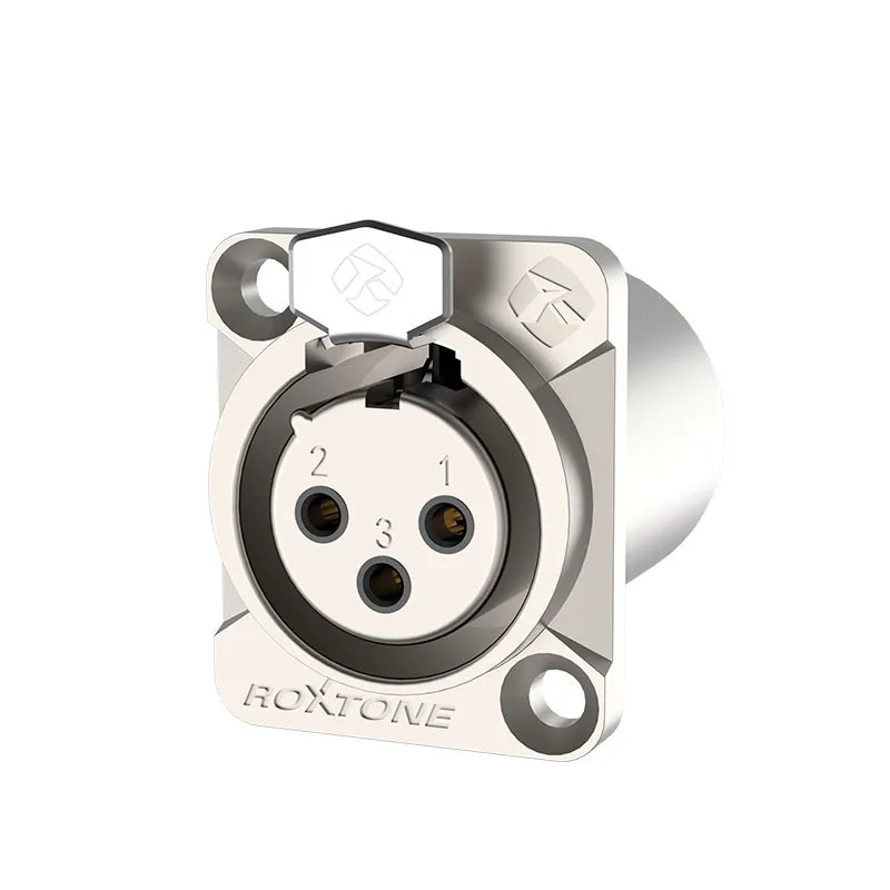 Roxtone RX3FDWP-NG — пыле- и влагозащищённый 3-контактный панельный разъём cannon (XLR) с IP66. Цельнометаллический корпус, фосфорно-бронзовые контакты с золотым покрытием. Есть заземляющее кольцо. Цвет — серебристый.