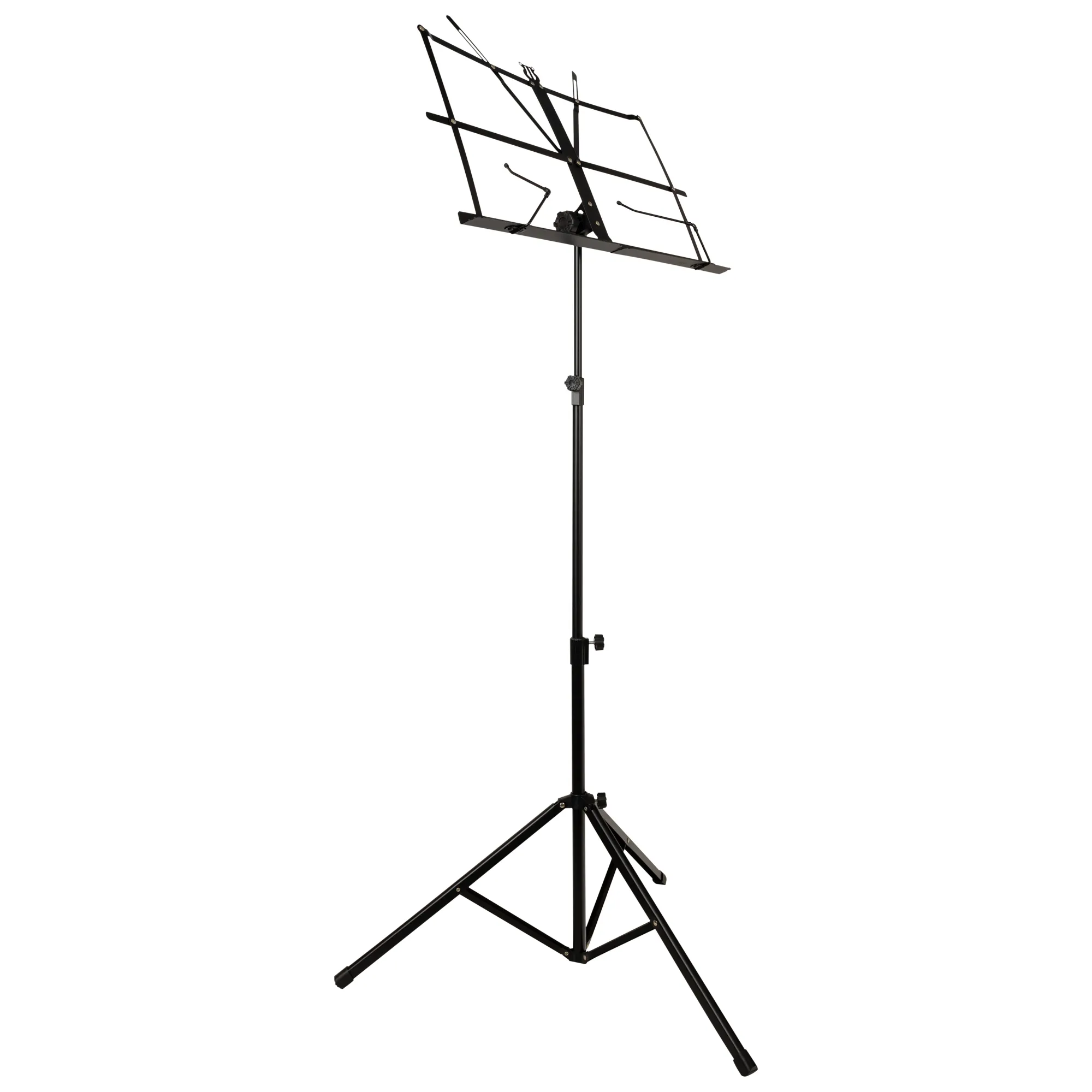 ROCKDALE P-01 – облегченный складной пюпитр для нот с водонепроницаемым чехлом для переноски. Высота ROCKDALE P-01 регулируется от 65 до 135 см, в связи с чем он подойдет как ребенку, так и взрослому в сидячем и стоячем положениях. Размер полотна для нот составляет 46x28 см и на нем имеются специальные зажимы для предотвращения соскальзывания.Несмотря на то, что стойка выполнена из стали, ее общий вес не превышает 830 г, и в сложенном состоянии она помещается в карман гитарного чехла. Надежное треножное основание оснащено резиновыми накладками для устойчивого положения пюпитра, а также для исключения лишних вибраций.