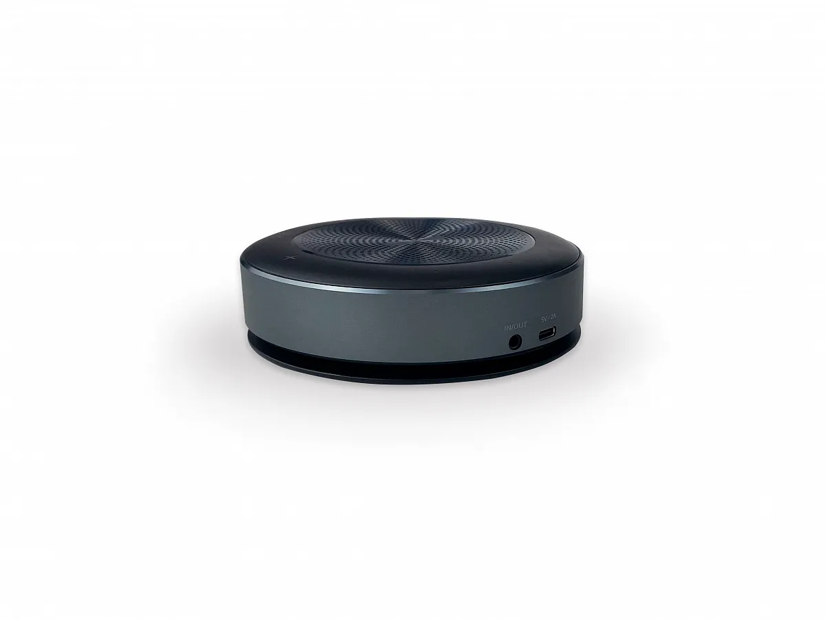 - Характеристики: массив из 6 направленных микрофонов, радиус стабильного захвата 5 метров, всесторонний захват звука с покрытием 360°, встроенный DSP-аудиопроцессор с поддержкой AEC, автоматическая функция шумоподавления, автоматическая регулировка уровня громкости, до 8 часов автономной работы без подзарядки, возможность объединения в каскад из двух спикерфонов, Plug&Play, зарядка по USB Type-C, подключение по Bluetooth, USB или AUX, встроенный Li-ion аккумулятор