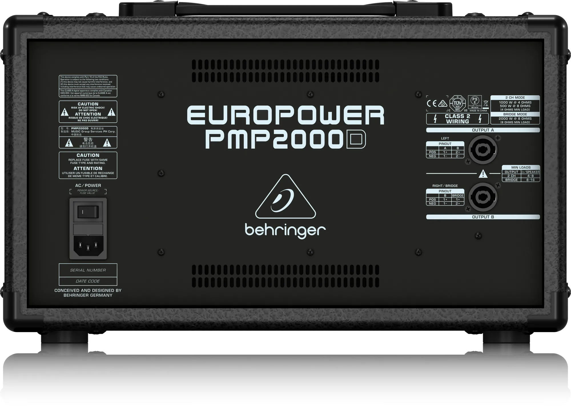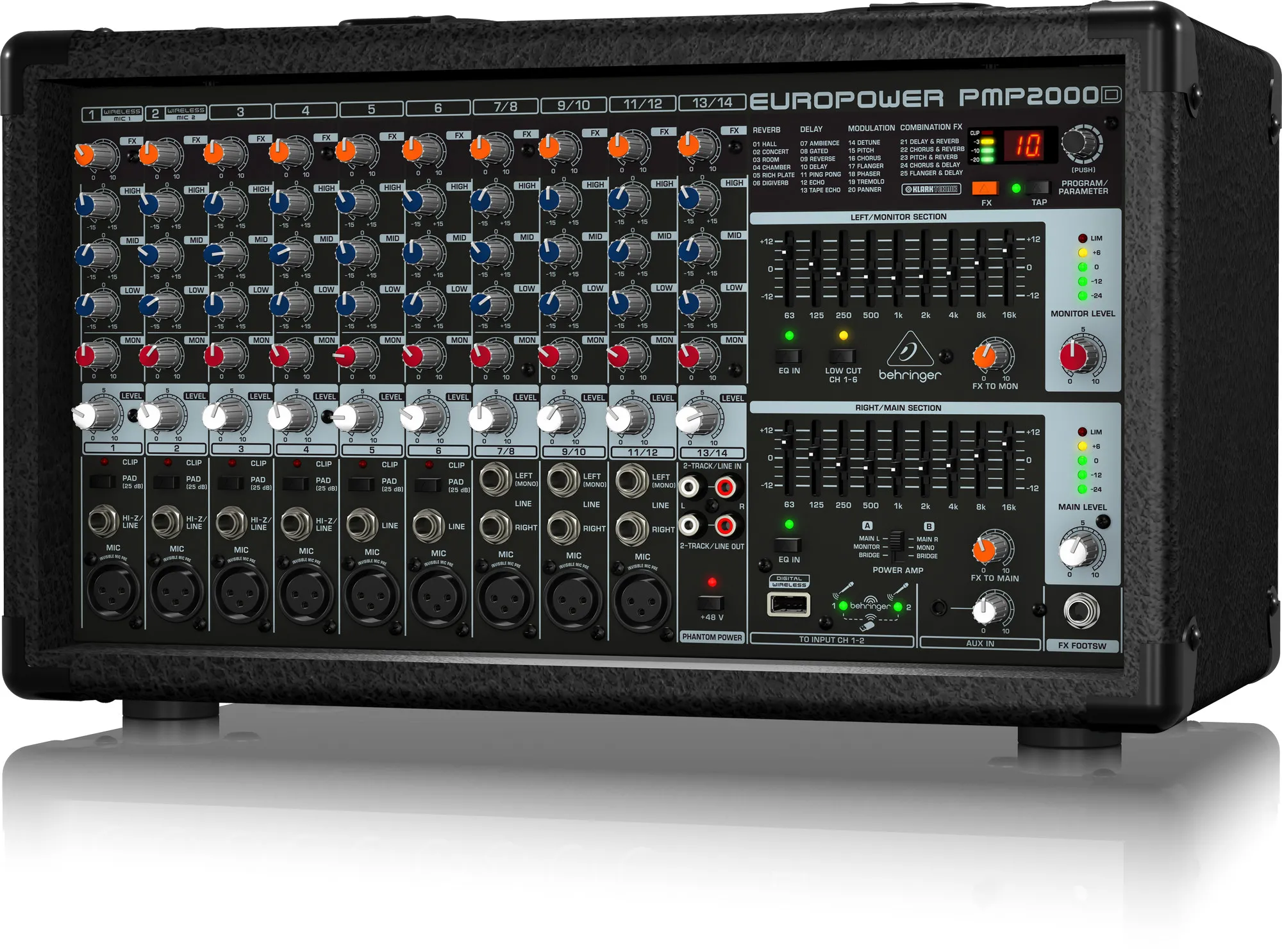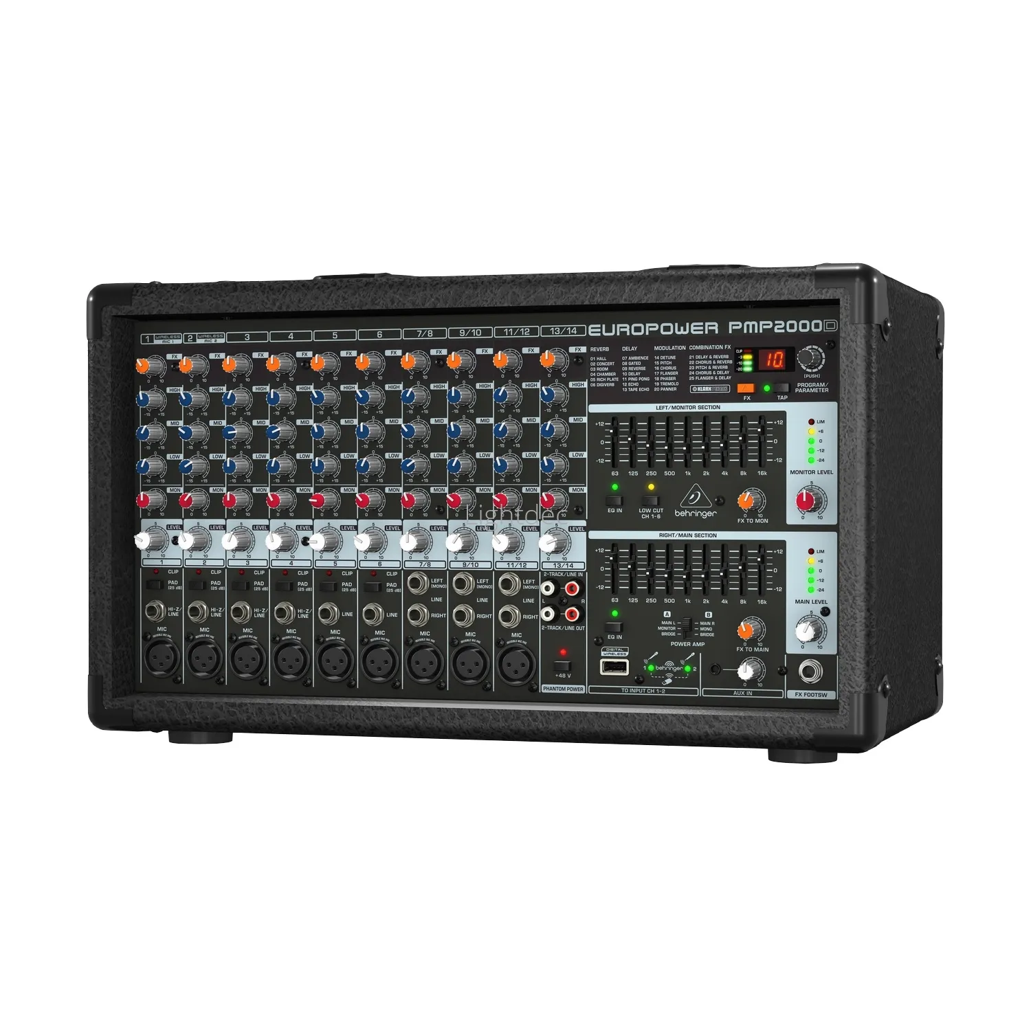 Микшер-усилитель Behringer PMP2000DМикшер-усилитель Behringer PMP2000D — компактное и удобное решение для живых выступлений. Устройство имеет 14 входных каналов, встроенный усилитель класса D с выходной мощностью до 2000 Вт и микрофонные предусилители IMP с динамическим диапазоном 130 дБ. Микшер оснащён процессором Klark Teknik с 25 пресетами эффектов и мультиэффектов, а также поддерживает подключение приёмника от радиосистемы ULM-серии.