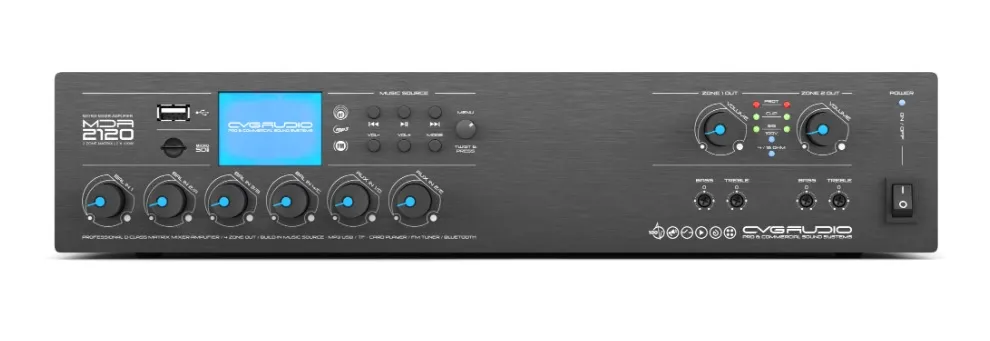 Матричный микшер-усилитель CVGaudio MDA-2120 — профессиональное устройство для создания многозонных звуковых систем. Оно имеет 6 входов, 2 выхода и 2 канала усиления по 120W. Модель оснащена встроенным источником сигнала с USB/microSD, Bluetooth и FM-тюнером. Поддерживает подключение микрофонных консолей и настенных контроллеров. Обеспечивает маршрутизацию сигнала и управление громкостью зон. Подходит для ресторанов, магазинов, фитнес-клубов и других объектов.