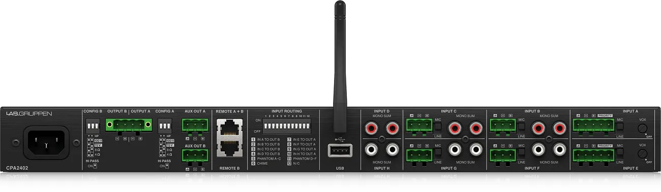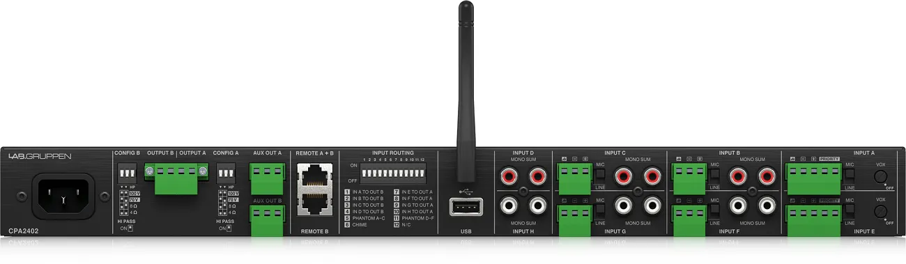 Микшер-усилитель Lab.gruppen CPA2402Микшер-усилитель Lab.gruppen CPA2402 — это двухканальное устройство класса D, разработанное в Швеции. Оно имеет 8 входов и 2 выхода, поддерживает воспроизведение музыки с USB и по Bluetooth. Рабочий диапазон частот составляет от 20 Гц до 20 кГц. Мощность каждого канала — 240 Вт. Устройство совместимо с различными акустическими системами и подходит для коммерческих систем звукофикации.
