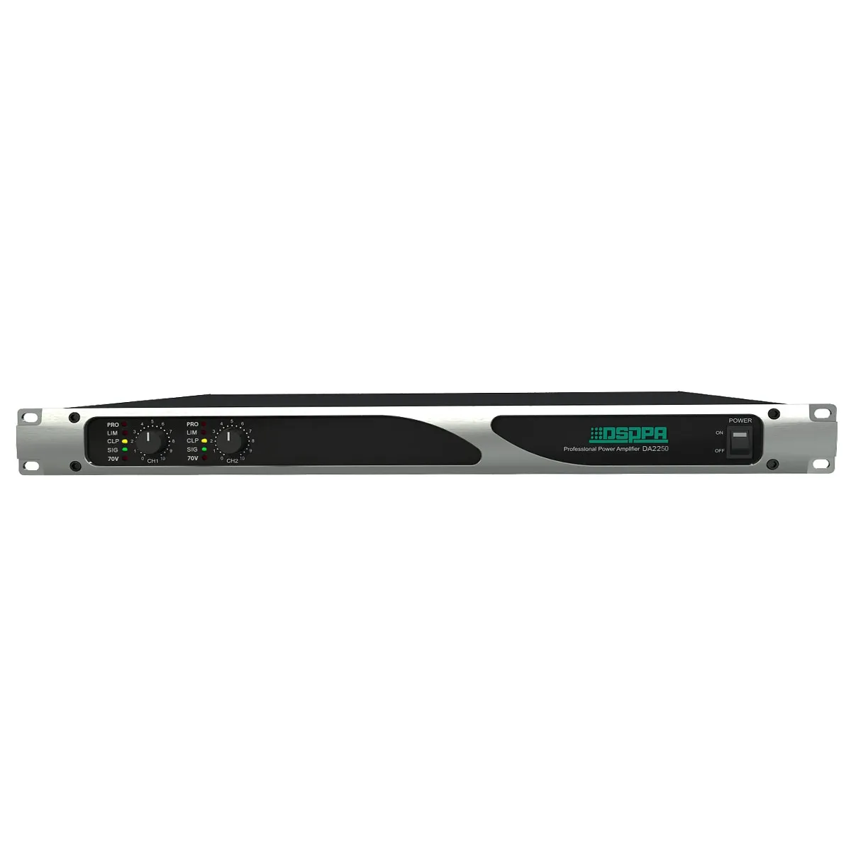 DSPPA DA-2250 — это профессиональный 2-канальный цифровой трансляционный усилитель класса D. Мощность на канал — 250 Вт. Диапазон частот: 20 Гц–20 кГц. Коэффициент нелинейных искажений — менее 0,3%, соотношение сигнала к шуму — более 80 дБ.