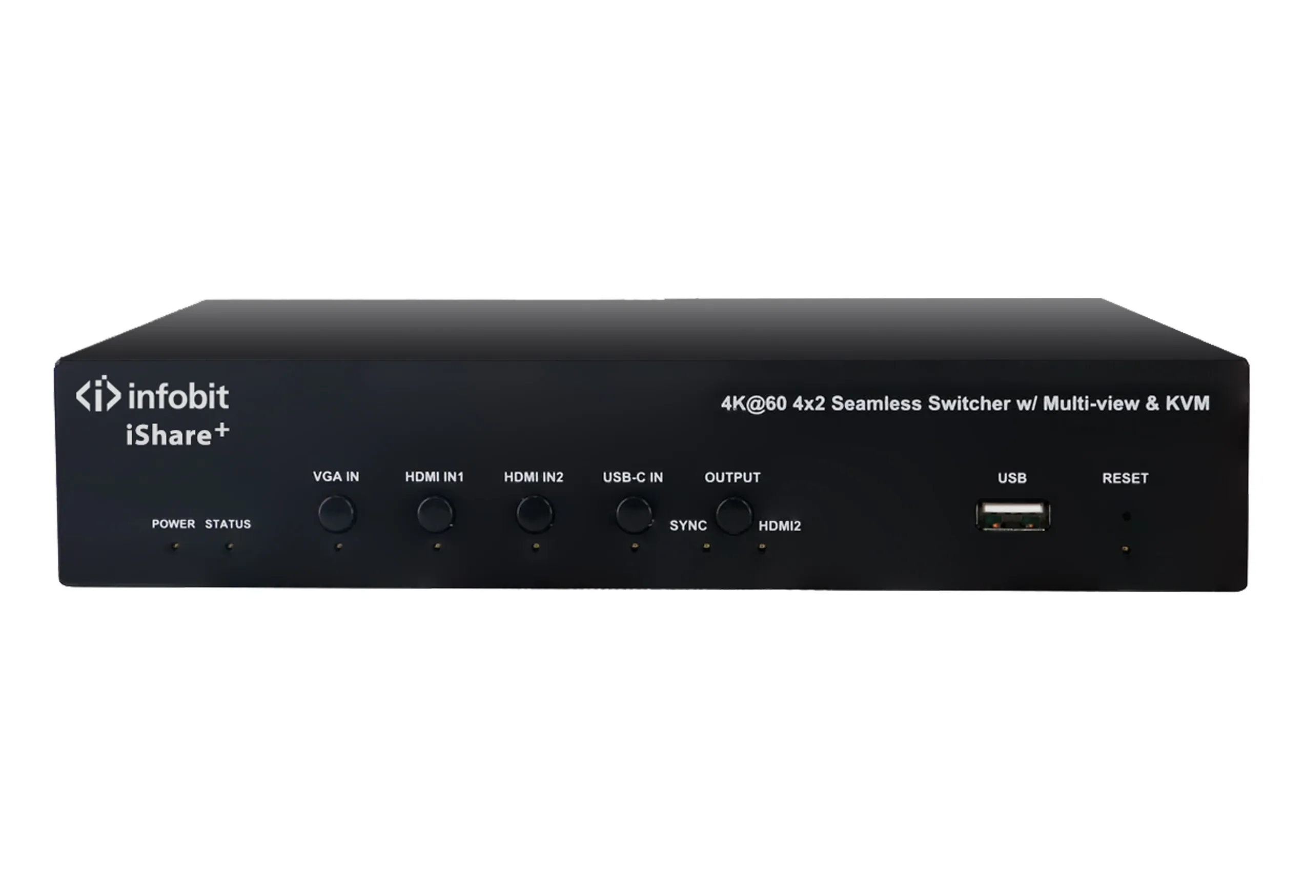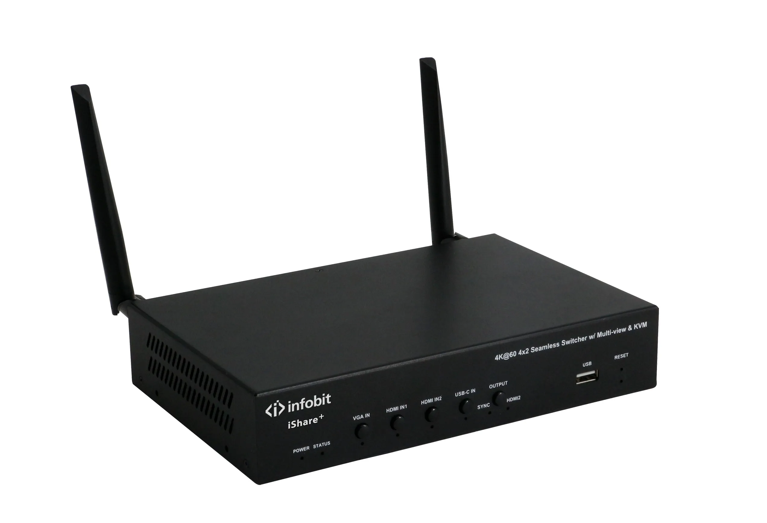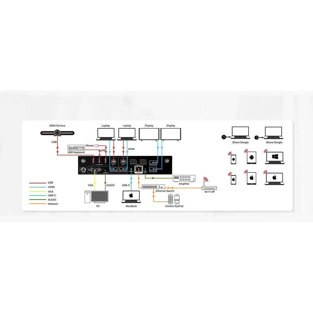 Краткое описание коммутатора iShare PlusInfobit iShare Plus — это коммутатор для презентаций, поддерживающий проводные и беспроводные подключения через Wi-Fi, Airplay Mirroring, Miracast и USB-ключ. Устройство имеет 4 локальных входа (VGA с аудио, HDMI 1 с KVM, HDMI 2 с KVM и USB-C) и поддерживает многоэкранные презентации с настраиваемой компоновкой экрана. Оно совместимо с камерой INFOBIT VB30 или сторонней USB-камерой и клавиатурой/мышью. Управление коммутатором возможно через кнопки на передней панели, веб-интерфейс, Telnet API и RS232.