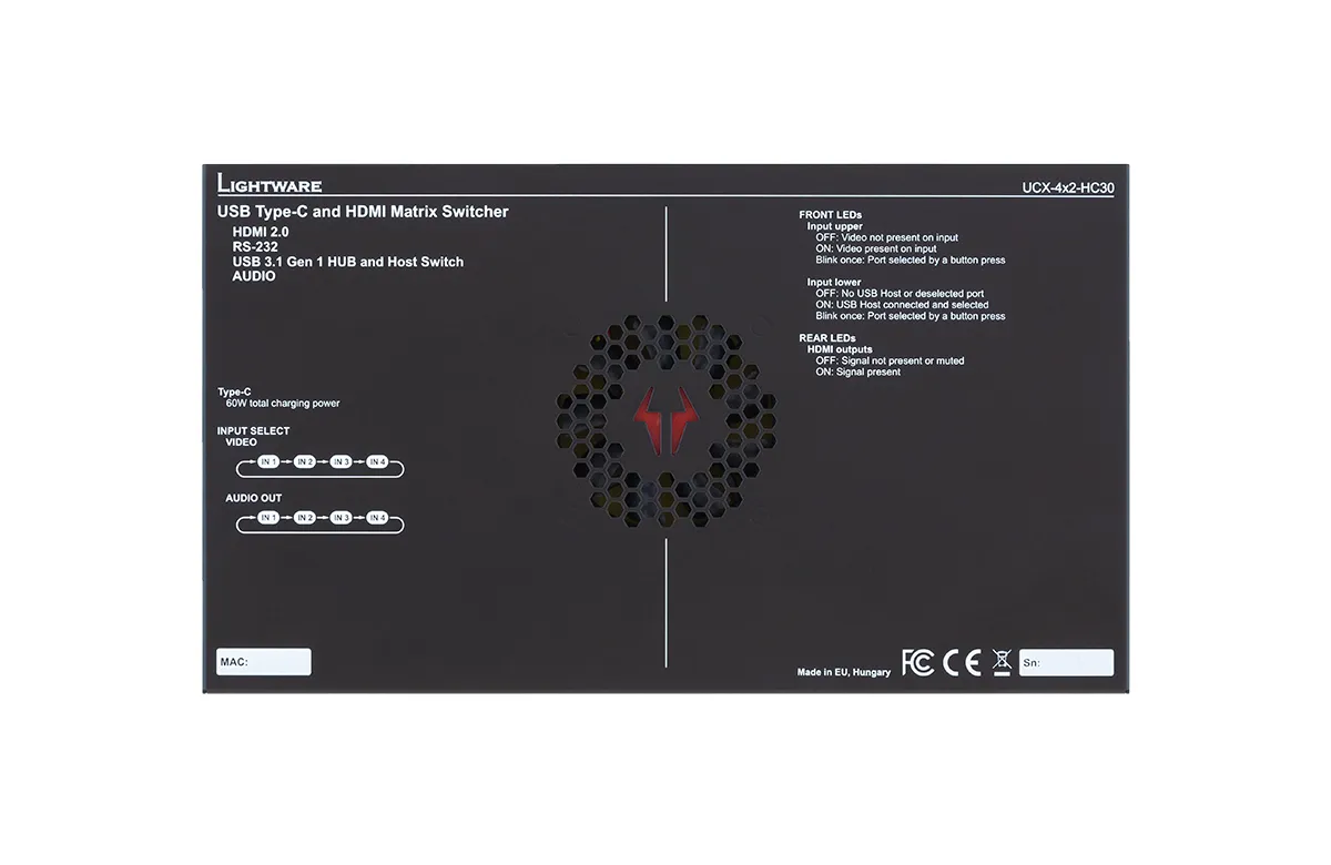 Матричный коммутатор UCX 4x2 с USB-C, HDMI 2.0 и USB 3.1. Поддерживает 4K UHD при 60 Гц, RGB 4:4:4 и скорость до 18 Гб/с. Имеет защищённый Ethernet и интерфейс USB-C для видео, аудио и управления.