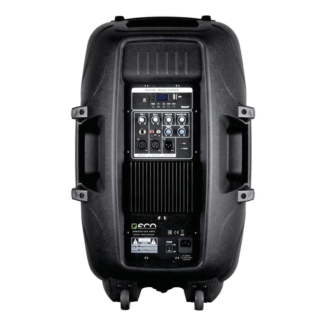 Акустическая система ECO Presto-12A MP3 — часть серии ECO–PLASTICA. Она оснащена встроенным усилителем и микшером. Благодаря новому материалу корпуса звучание приближено к фанерным системам, но масса меньше.