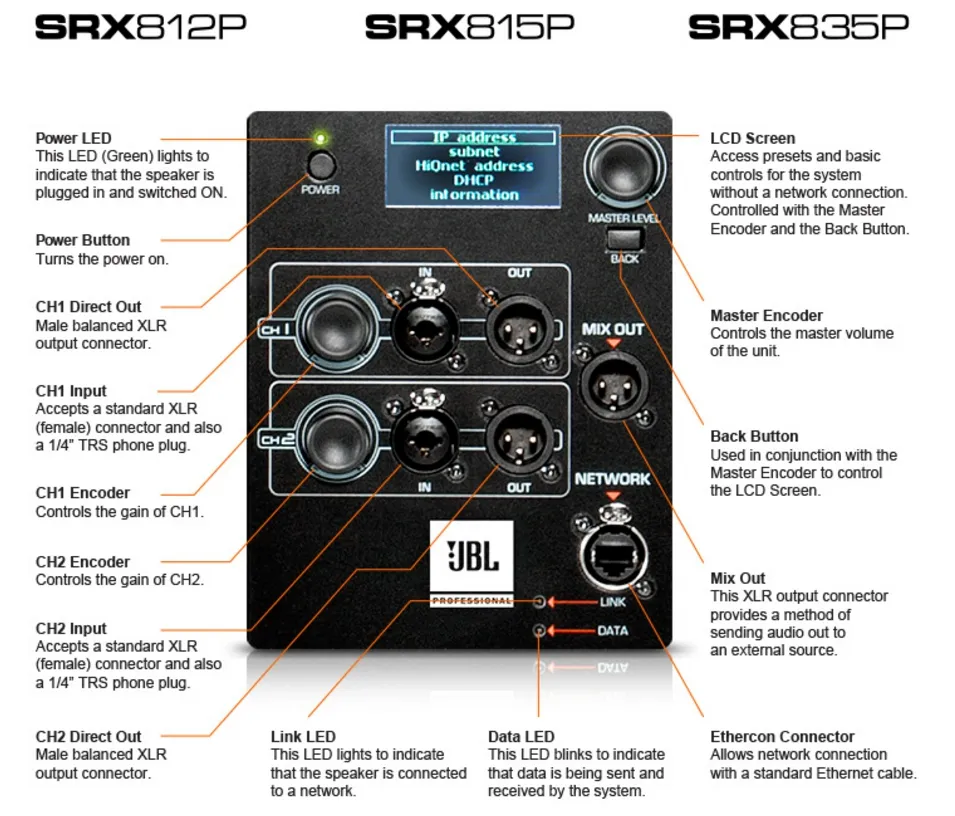 JBL SRX835P — профессиональная акустическая система для живых выступлений и инсталляций. Она оснащена трёхполосным динамиком и встроенным усилителем мощности. Пиковая мощность достигает 2000 Вт, звуковое давление — 137 дБ. Система поддерживает сети HiQNet и имеет ЖК-экран для управления.