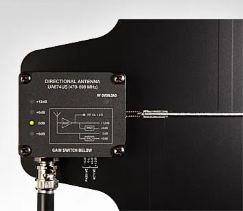 SHURE UA874WB — активная направленная UHF антенна с диапазоном частот 470–900 МГц. Имеет встроенный усилитель с четырьмя вариациями выбора усиления для компенсации потерь сигнала в кабеле. Можно монтировать отдельно, подвешивать на фермы или стены. Совместима с беспроводными приёмниками Shure.
