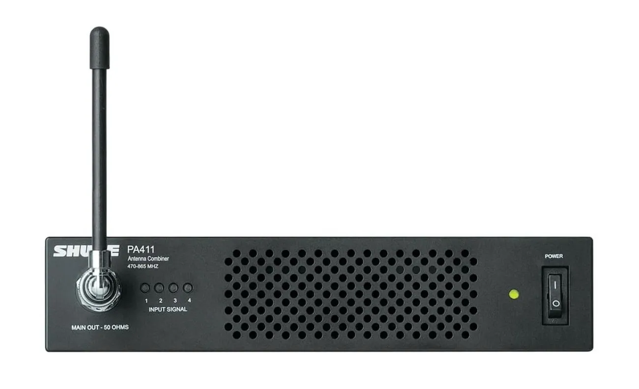 Антенный комбайнер Shure PA411-E распределяет питание и сигнал между четырьмя передатчиками Shure PSM 300. Система с компактными размерами уменьшает количество антенн и источников питания. Диапазон частот: 470–865 МГц. К главному выходу можно подключить антенну с разъёмом BNC. Индикаторы показывают наличие сигнала и перегрузку. Питание для передатчиков идёт через кабель в комплекте.