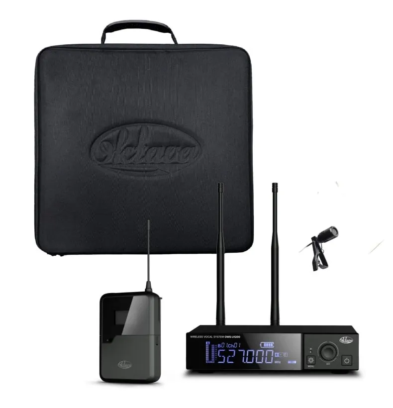 Описание радиосистемы Октава OWS-U1200L02 PlusРадиосистема Октава OWS-U1200L02 Plus — это оригинальное устройство с петличным микрофоном (конденсаторный электретный, круговая диаграмма направленности), поставляется в фирменном кейсе. Металлический корпус приёмника размером 1/2U позволяет устанавливать его на стол или в стойку с помощью дополнительного крепления. Система автоматически сканирует и выбирает наименее загруженную частоту в диапазоне 512—562 МГц. Синхронизация и передача настроек приёмника и передатчика осуществляются через ИК-порт. Яркий LCD-дисплей отображает рабочую частоту канала, уровень сигнала, заряда аккумулятора и другие параметры.