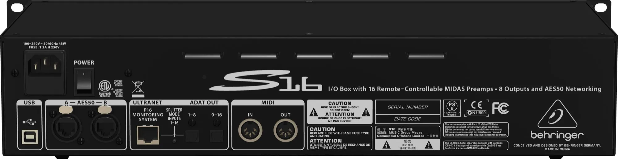Behringer S16 – это коммутационный блок, представляющий собой сценический модуль для подключения аудио устройств к цифровым микшерам X16 и X32, а также мониторной системе P16. Функциональность модуля значительно повышается благодаря интерфейсам AES50, ADAT, ULTRANET, USB, MIDI и наличию дистанционного управления. В случае использования модуля S16 функционируют как компоненты Х32 системы. Два S16 каскадируются через AES50 порт, поддерживая 32 mic/line входов, 16 выходов и подключение P-16, способной питать до 48 мониторов.Управление посредством monitoring/head amp дает возможность выбрать любой из 16 входов, 8 выходов или выход Р16. Счетчик сигнала может быть дополнен установкой индивидуального канала Gain плюс, предоставляющего возможность непосредственного прослушивания входного сигнала посредством наушников.