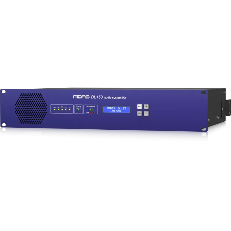 MIDAS DL153 — это аудиоинтерфейс с 16 дистанционно управляемыми микрофонными предусилителями. Предусилители работают от фантомного питания +48 В. Предусмотрена регулировка усиления от -2,5 до +45 дБ с шагом в 2,5 дБ. Частота семплирования — 96/48 кГц. Входные/выходные терминалы оснащены балансными XLR-разъёмами. На задней панели — 8 линейных аудиовыходов. Двойные сетевые порты AES50 от Neutrik со светодиодной индикацией. Устройство можно установить в рэковую стойку 2U.