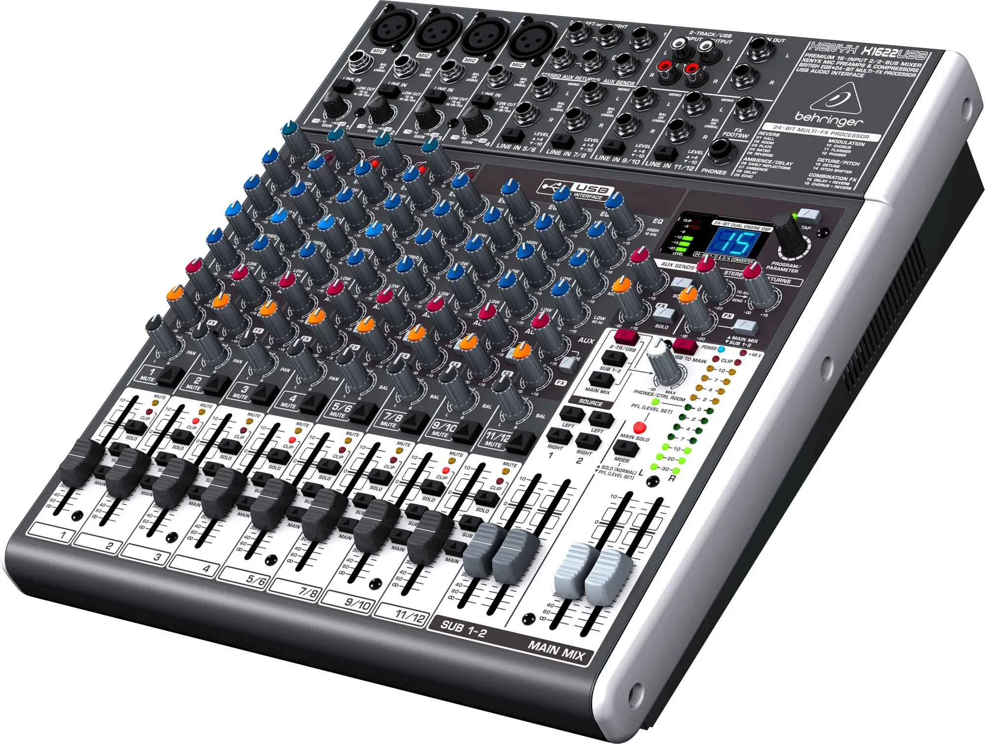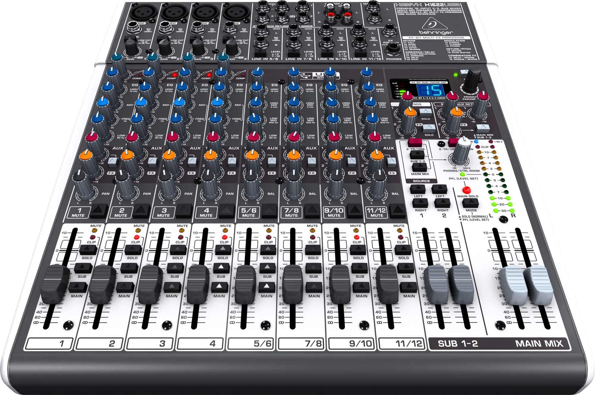 Пассивный аналоговый микшер Xenyx X1622USB предлагает 12 моно-входов, четыре входные стерео пары, четыре микрофонных входа с отдельными предусилителями и независимым компрессором на каждый канал. Диапазон воспроизводимых частот микшера представляет характеристики от 20 до 20000 Герц. Каждый микрофонный канал имеет свой независимый предусилитель, поднимающий уровень звукового сигнала до 60 децибел с динамическим сопротивлением в 26кОм. Микшер оборудован несколькими шинами Aux для маршрутизации звукового сигнала и цифровым процессором эффектов, предлагающим самые разнообразные эффекты для обработки вокала и музыкальных инструментов. Используя интегрированный USB порт Вы можете подключать микшер к персональному компьютеру.