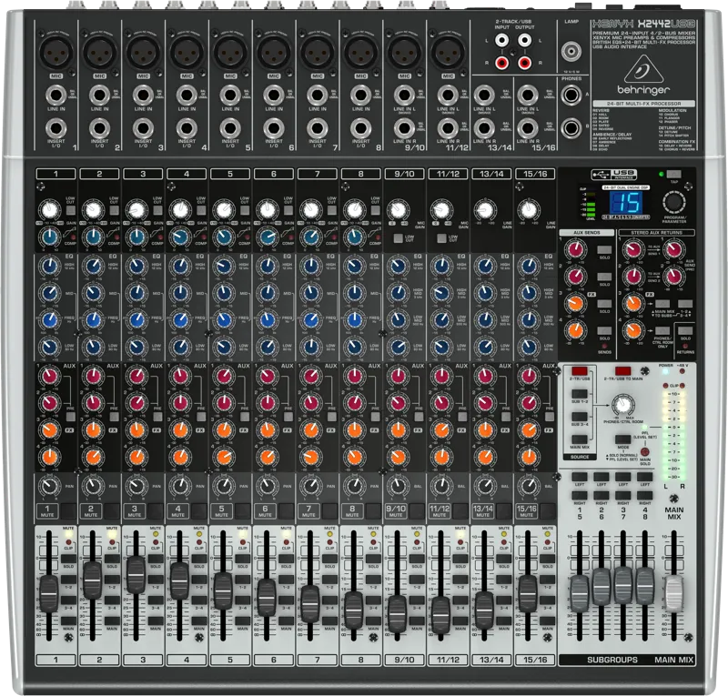 Наличие 4 AUX-шин в BEHRINGER X2442USB дает возможность создавать 2 посыла до фейдера и 2 посыла после него, если Вы используете в работе этот малошумящий пульт. Пульт оснащен новым 24-битным процессором мультиэффектов и 16 пресетами, которые можно редактировать, добавляя свои настройки, и сохранять для дальнейшего использования.