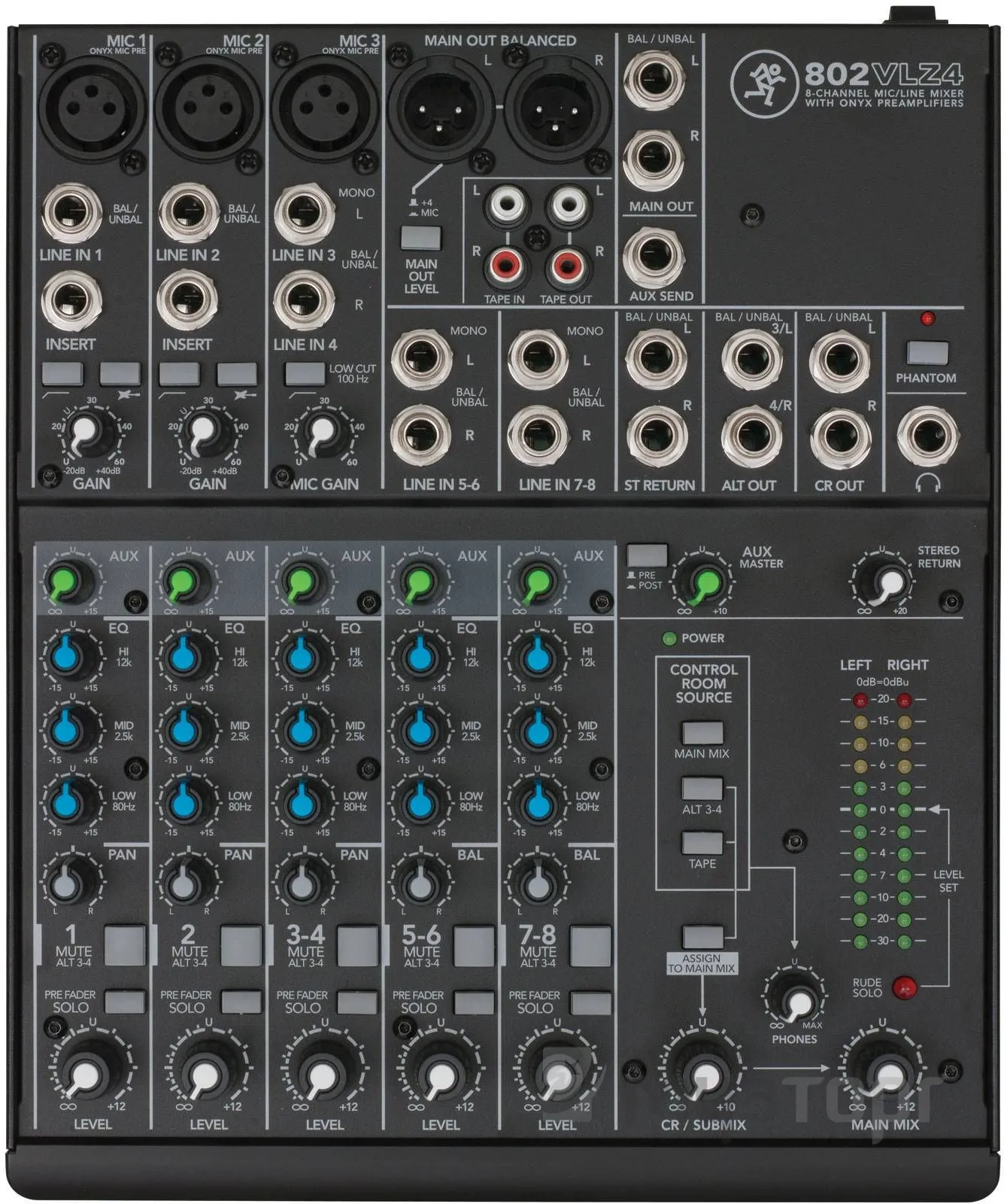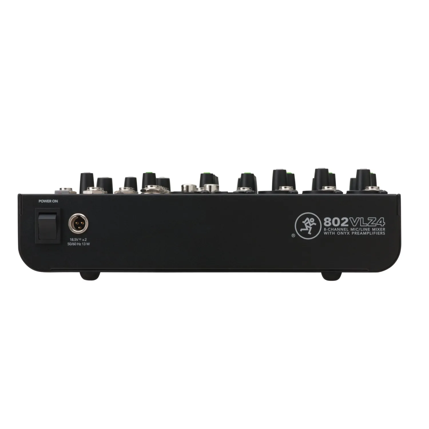 Аналоговый микшер MACKIE 802 VLZ 4 выдержан в фирменном стиле производителя, это прочный стальной корпус, качественные, светло-серые ручки настроек и оригинальный, современный дизайн. Ручки настроек выполнены с использованием контрастной краски, что позволяет использовать микшер даже в помещении со слабым освещением. Адаптер питания микшера внешний. Подключение адаптера происходит через разьем на внешней верхней панели, что позволяет микшеру использовать минимум места при стационарной установке. Производитель оборудовал микшер тремя микрофонными входами с разьемами XLR, один из которых может работать в стерео режиме при подключении цифровых синтезаторов или фортепиано. Три стереоканала микшера оборудованы стандартными разьемами 1\4 Jack.
