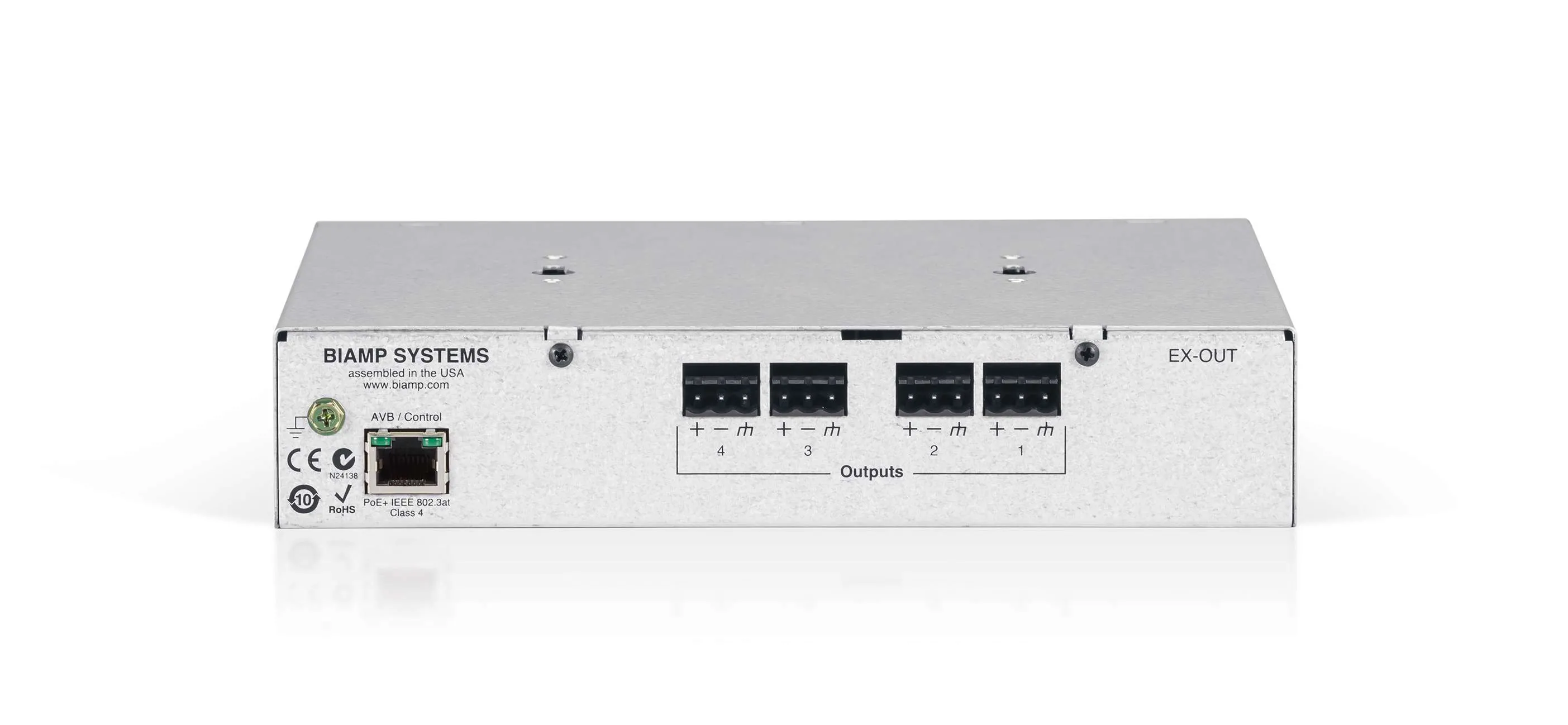 Описание модуля Tesira EX-OUTTesira EX-OUT — это модуль расширения, который увеличивает количество выходных аудиоканалов цифровых серверов Tesira (поддерживающих AVB) на 4 штуки. Он оснащён 4 симметричными выходами с клеммными разъёмами Euroblock.