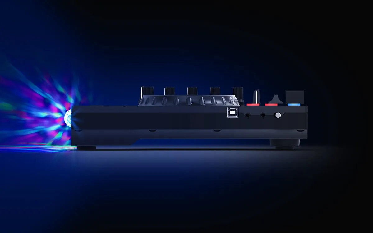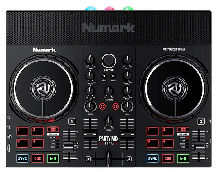 Numark Party Mix Live — компактный двухканальный DJ-контроллер с LED-эффектами и стереодинамиками. В комплекте — Serato DJ Lite для доступа к стриминговым платформам. Есть пэды для эффектов, меток, петель и семплов. Большие сенсорные джоги для скретчинга. Поддерживает iOS-приложения. Подключение к внешней системе через 1/8” разъёмы.