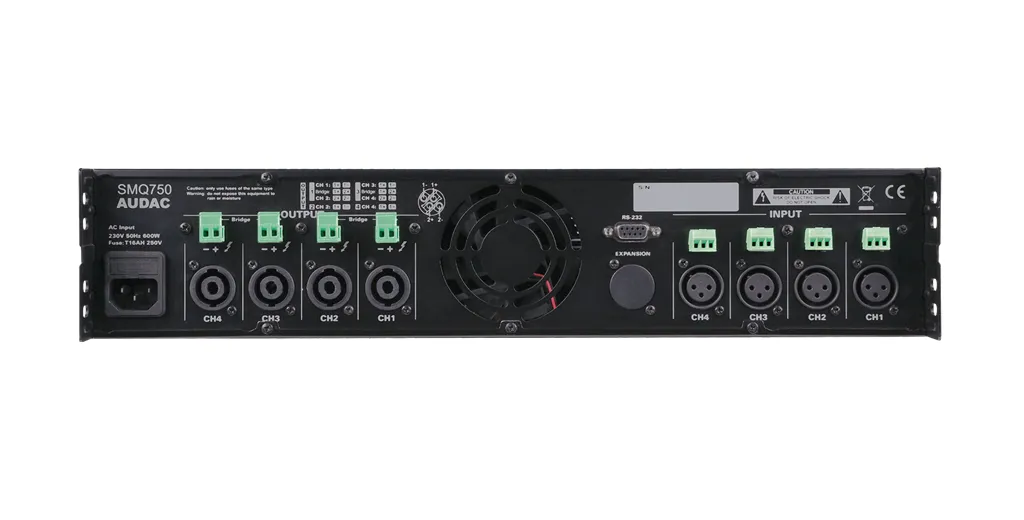AUDAC SMQ750 - это высококачественный усилитель мощности класса D, предназначенный как для стационарных, так и для туровых комплексов звукоусиления. Данная модель относится к серии четырехканальных усилителей - SMQ.Прежде всего, данная модель оснащена цифровым информативным ЖК дисплеем, на котором отображается текущий режим работы усилителя, и все необходимые настройки и параметры. Также, на его передней панели расположен цифровой порт USB, который в свою очередь позволяет загружать на внешний накопитель пользовательские предустановки, а так же выполнять роль USB-ключа. Стоит отметить, что вход в систему при наличии вышеупомянутого ключа может осуществляться на двух уровнях: "Администратор" и "Пользователь". Дополнительно, в усилителе предусмотрен управляющий цифровой порт стандарта RS-232.