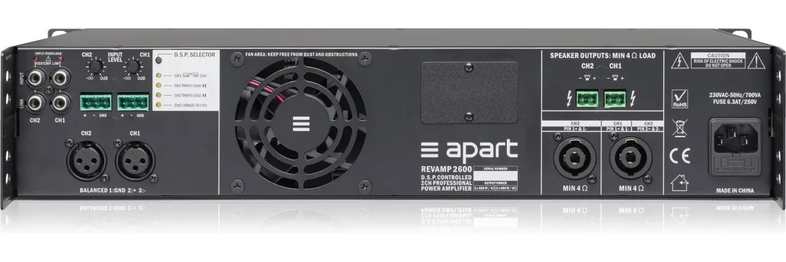 Полная выходная мощность у BIAMP APART REVAMP2600 зависит от числа подключенных одновременно каналов: к примеру, это будет 600 Ватт на канал при подключении нагрузки 4 Ома, и 300 Ватт на канал при нагрузке 8 Ом. Передняя панель усилителя предоставляет доступ к информативному графическому ЖК-дисплею с управляющими кнопками и светодиодам клиппинга и наличия сигнала. Тумблер питания тоже располагается на передней панели. Есть там и воздухозаборники: для лучшего охлаждения воздух прогоняется сквозь корпус и выводится наружу с помощью вентилятора на тыловой части. Усилитель обладает полной защитой схем от замыкания, перегрева, инфразвука, ультразвука и радиочастотных помех.