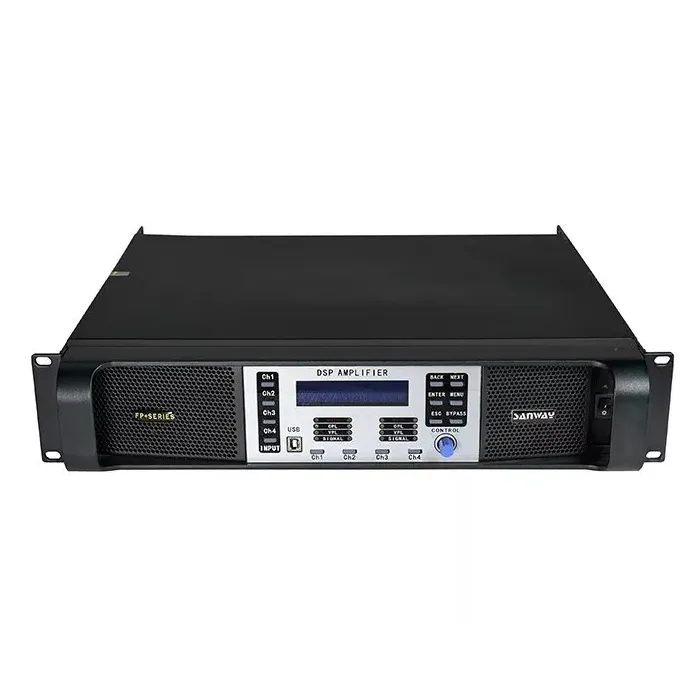 Sanway DSP-10KQ — четырёхканальный цифровой усилитель мощности с DSP. Класс TD. Мощность: 4 х 1300 Вт / 8 Ом, 2200 Вт / 4 Ом. Особенности: импульсный источник питания, мониторинг неисправностей, плавное включение, защита от перегрузки и короткого замыкания. Высокая эффективность, низкий нагрев.
